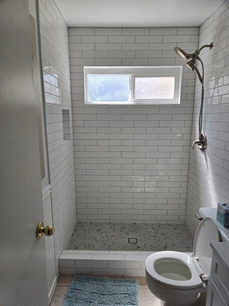 Bathroom with white and black tiled shower, sliding glass door, and a toilet.