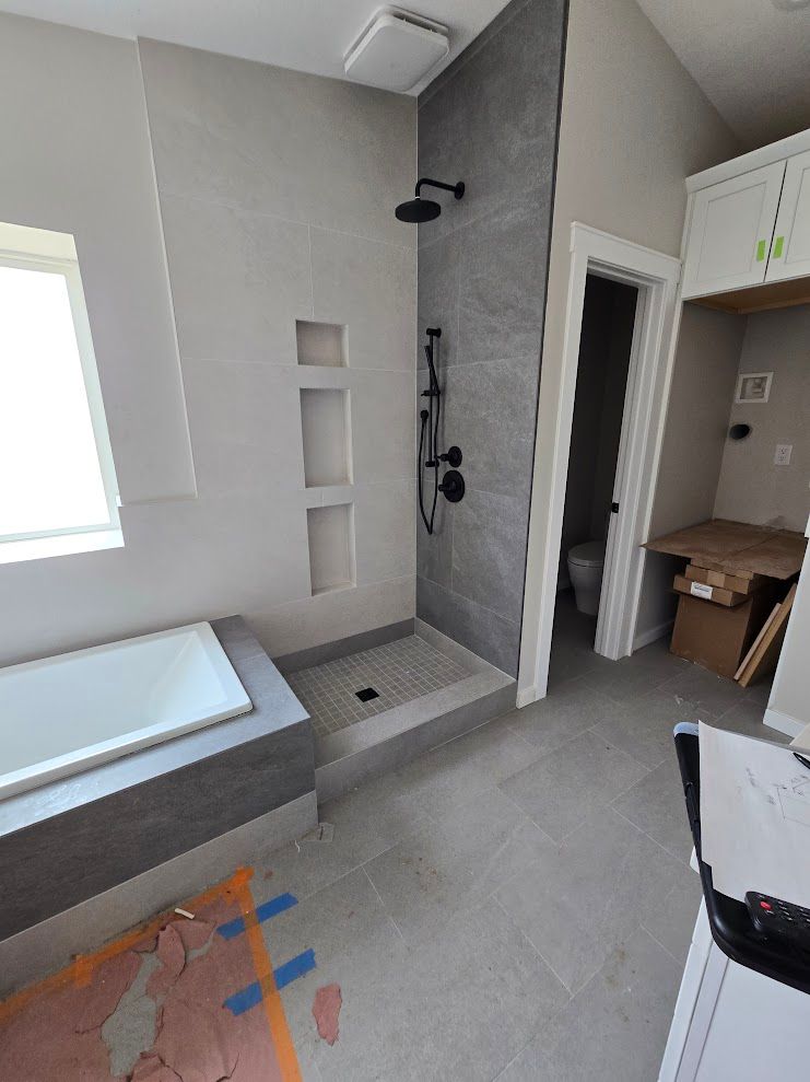 Modern bathroom with glass shower enclosure, gray tiled walls, and a white soaking tub.