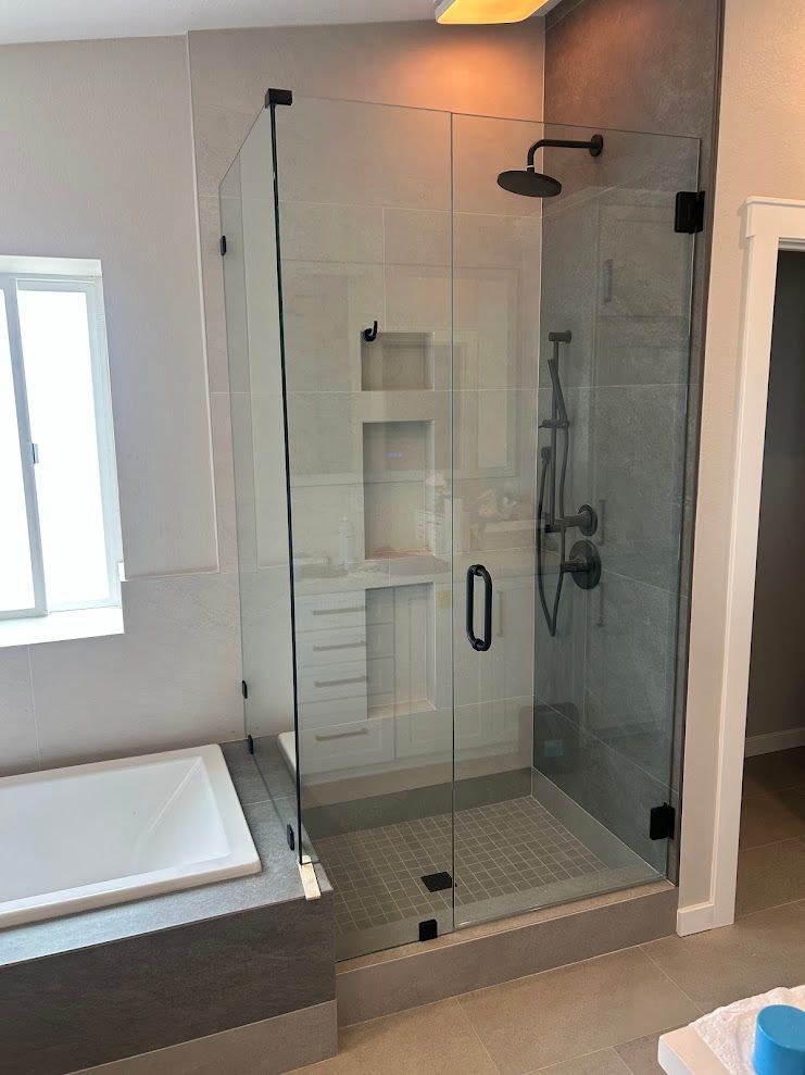 Modern shower with glass door, black fixtures, and built-in shelving. Light gray and blue tile.